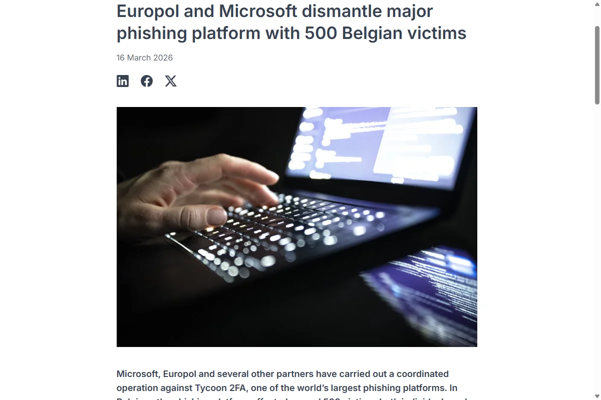 On March 16, Europol and Microsoft announced the dismantling of Tycoon 2FA — one of the world's largest phishing-as-a-service platforms, with one particularly nasty trick: it bypasses multi-factor authentication. In Belgium alone, around 500 individuals and businesses were among its 96,000 victims worldwide.